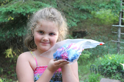 Here is my niece proudly holding her finished shirt. She’ll be in second grade next year, and she tie-dyed her shirt all by herself! Once you have added dye, place the shirt in a plastic bag and let it set for several hours. Then rinse, wash and wear!